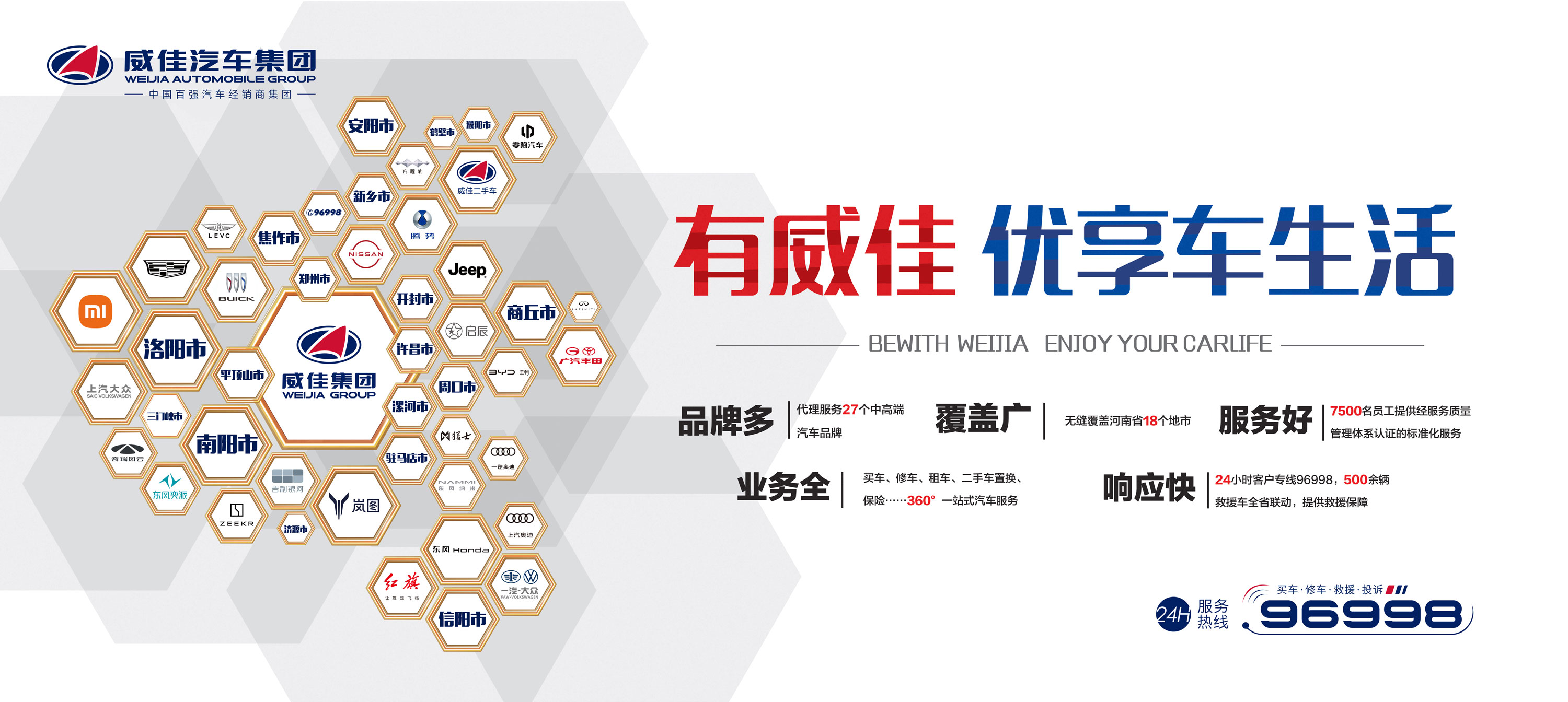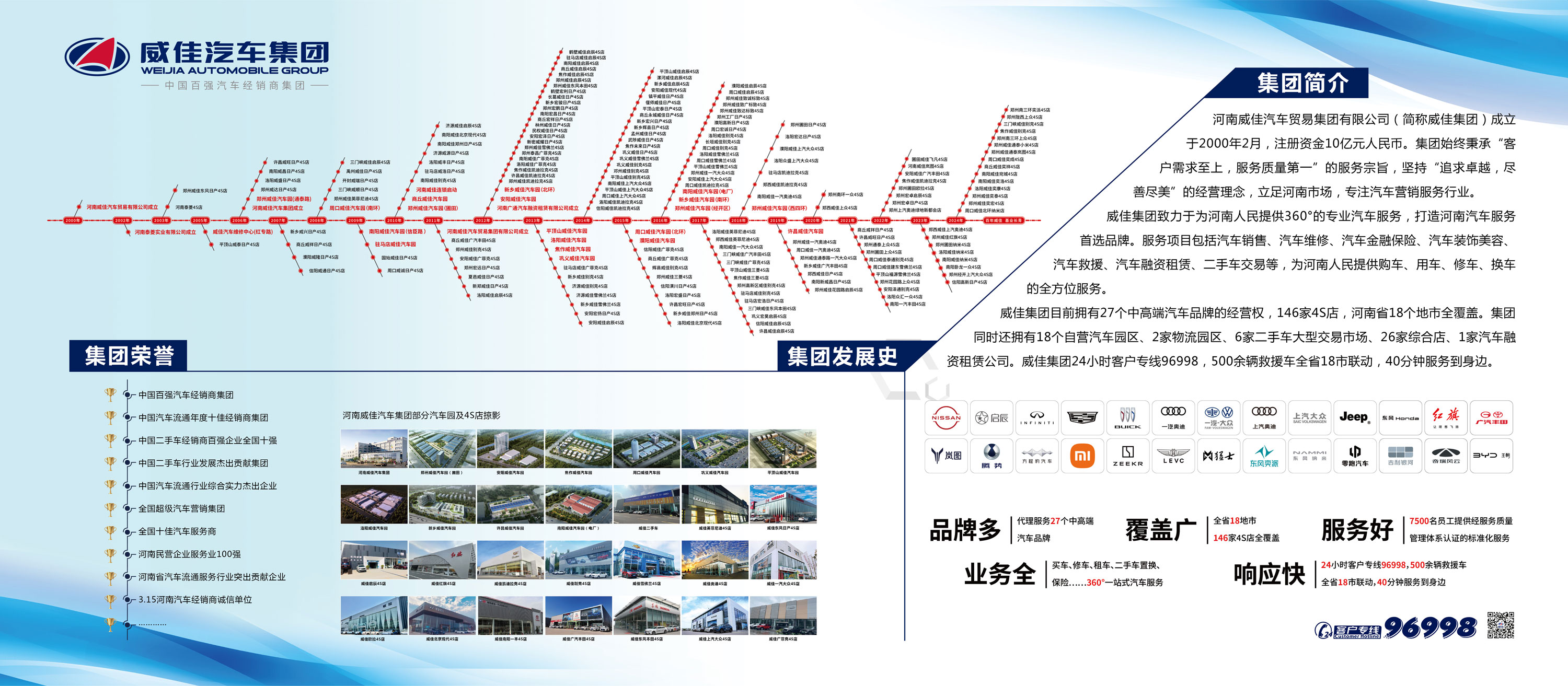 九游(中国)集团目前拥有27个中高端汽车品牌的经营权,146家4S店,河南省18个地市全覆盖。集团同时还拥有18个自营汽车园区、2家物流园区、6家二手车大型交易市场、26家综合店、1家汽车融资租赁公司。